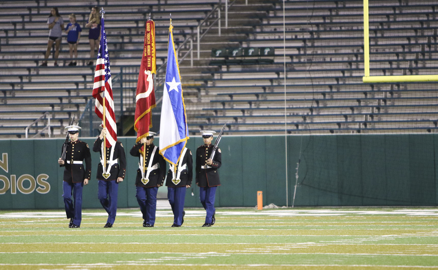 Members of the Jesuit MCJROTC color guard present the colors for the national anthem. -