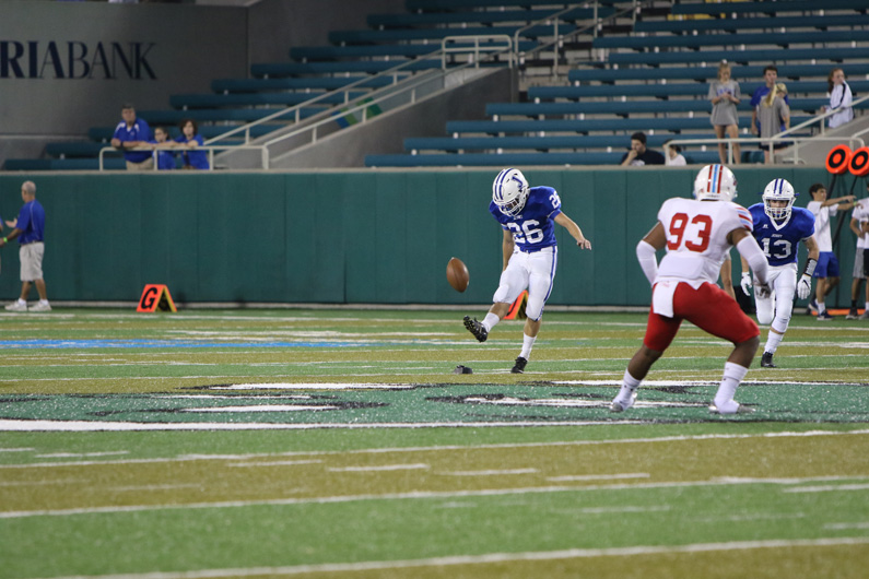 Kicker Max Scheurich gets the game going with the opening kickoff. -