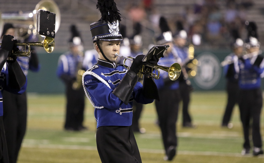 Blue Jay bandsman Quinn Patron plays trumpet during the halftime performance. -