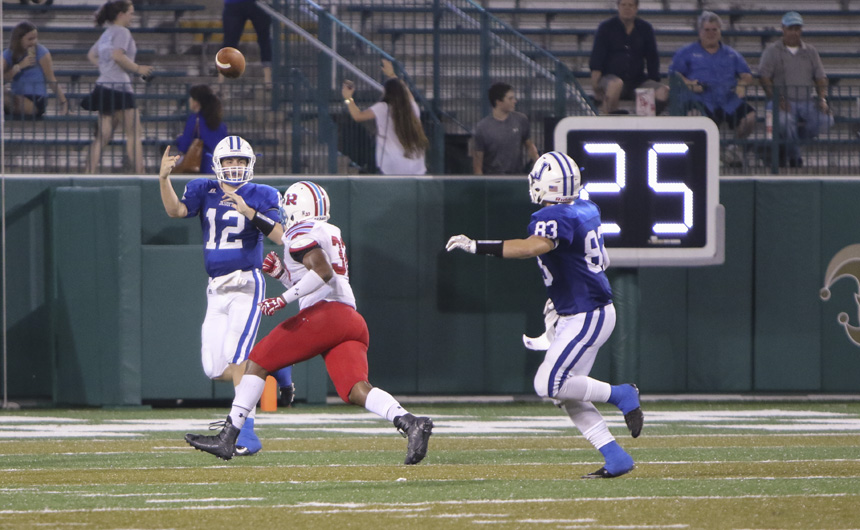 The defense maintained their composure through the late-game surge by Rummel, interrupting both attempts at 2-point conversions. Junior Cameron Helm again showed his determination to keep the Raiders out of the end zone by perfectly timing his break on the ball and batting down a passing attempt for one of the conversions.