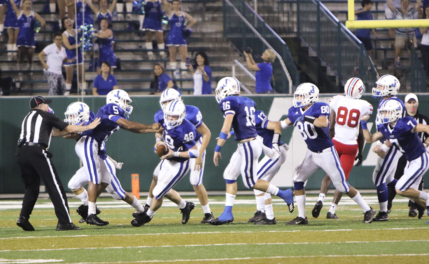 The defense continued to hold the line for the Jays on the next Raider drive. Rummel tried to even the score with a methodical march down the field, taking the ball all the way down to Jesuit’s 1-yard line. Not to be intimidated on the 4th-and-1 attempt at the end zone, junior defensive back Cameron Helm tore through Rummel’s offensive line and delivered a hard-hitting tackle to force a turnover on downs.