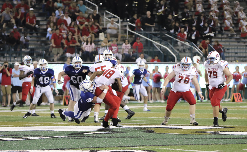 The defense keeps a lid on the Raiders from the start. Defensive back Michael Hull and linebacker Matthew Sauviac take down the Rummel receiver. -