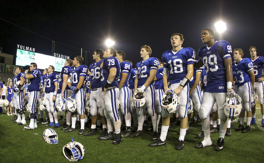After a hard-fought game, the Blue Jay football team gathers to sing the Alma Mater. -