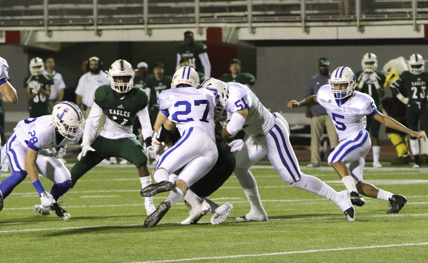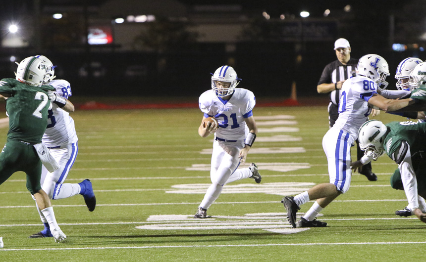 Except for the mid-game scores by Shaw, the Blue Jays out-shined the Eagles in every other aspect of the game. The first score for the Jays came mid-way through the first quarter, when junior Will Moran found the end zone on a brilliantly executed reverse play. Jesuit extended its lead to 14-0 late in the second quarter on a 19-yard touchdown reception by senior tight end Dylan McKeough. The McKeough touchdown was set up by the first of two 40-plus yard receptions by junior receiver Noah Varnado.