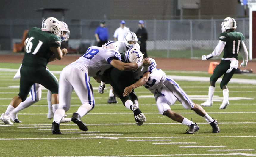 Senior linebackers Hunter Faust and Ryan Smith close in on the Shaw running back to make the tackle.