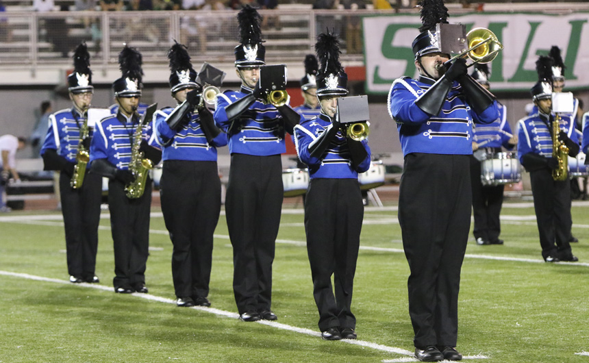 Karon Smith plays flute for the band during the haltime preformance. -