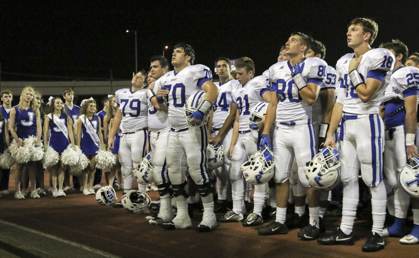 The Blue Jays ring in their first district win by singing the Jesuit Alma Mater. -
