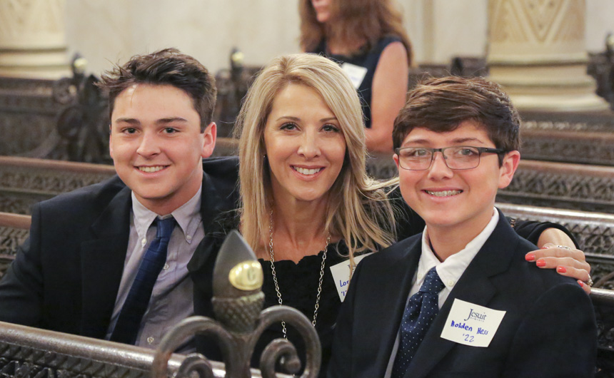 Lorraine Hess and her sons Christian ’18 and Holden ’22 take their seats before Mass begins at the Church of the Immaculate Conception.
