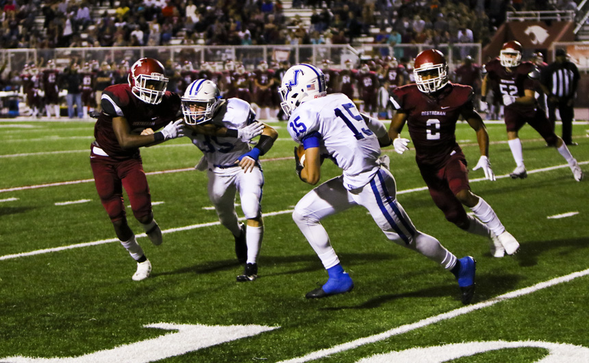 Into the Red Zone! Robert McMahon is pushed out of bounds after Jesuit converts on 4th and 5. -