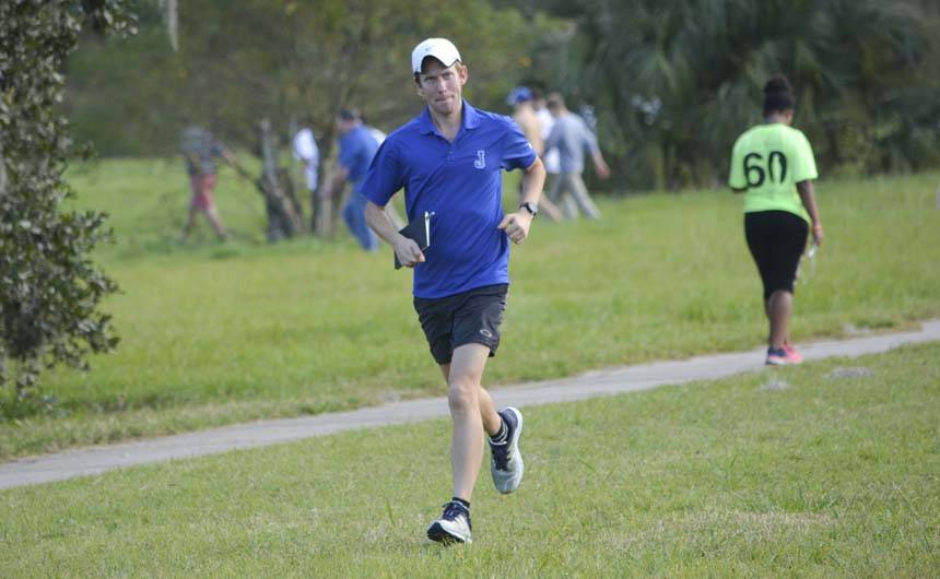Assistant coach Peter Flores flashes his old running skills to meet runners on another section of the course. -