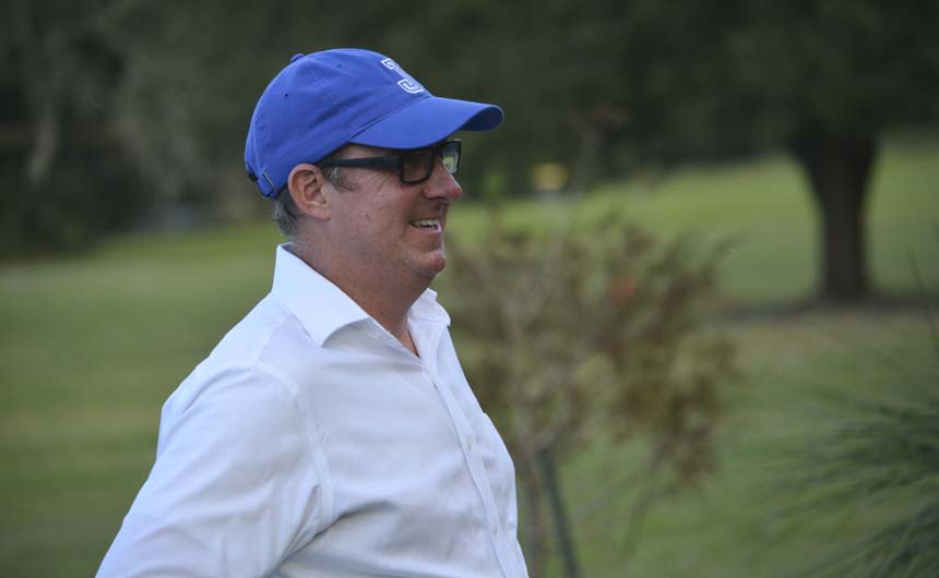 English teacher Mike Prados gathers runners for some post-race literary analysis. -