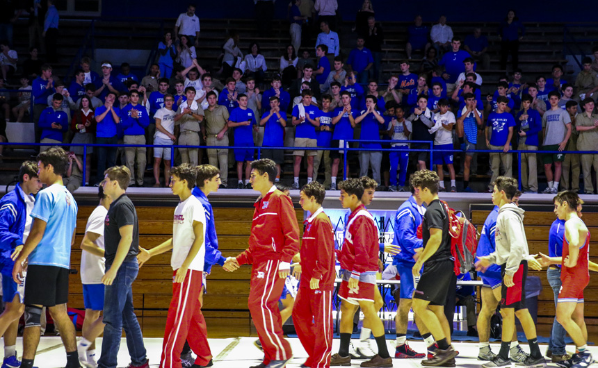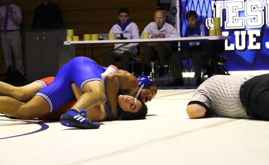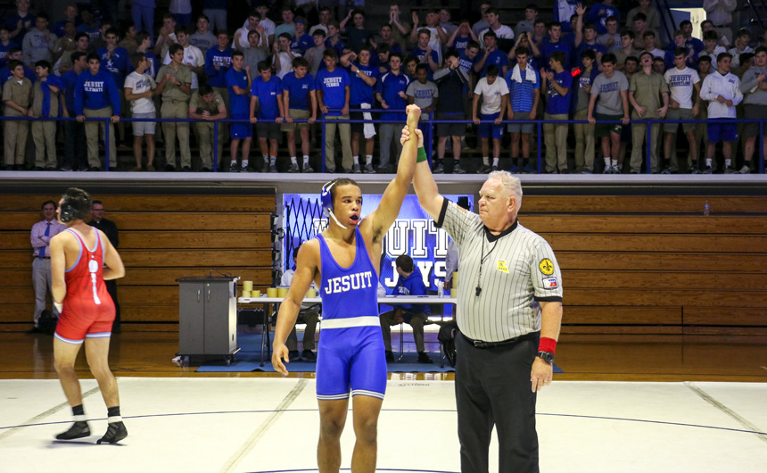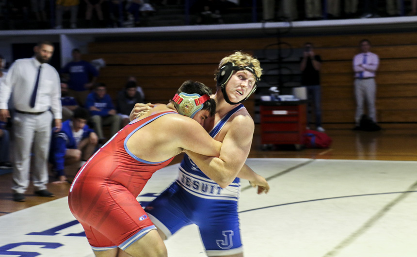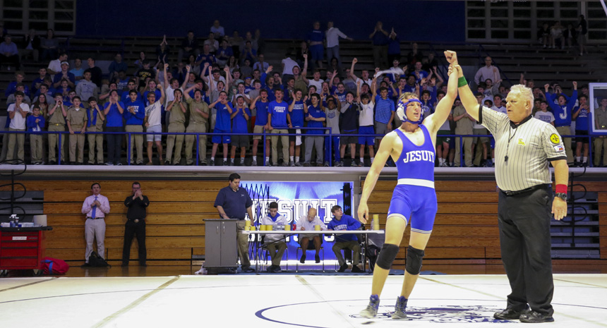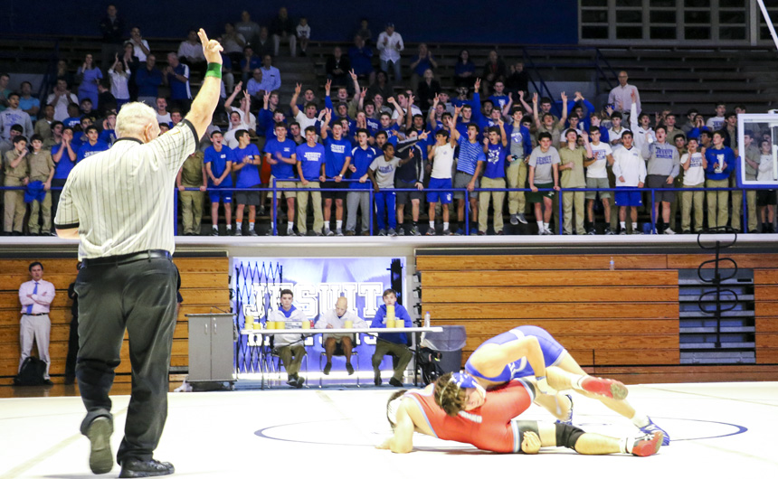 In front of a massive home audience, the Blue Jay wrestling team shined bright Wednesday night in its opening dual meet against Archbishop Rummel, winning 53-9.