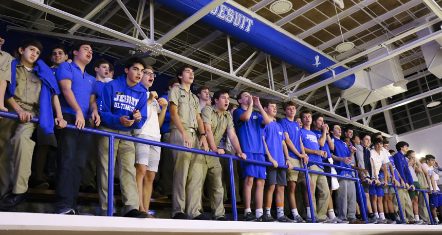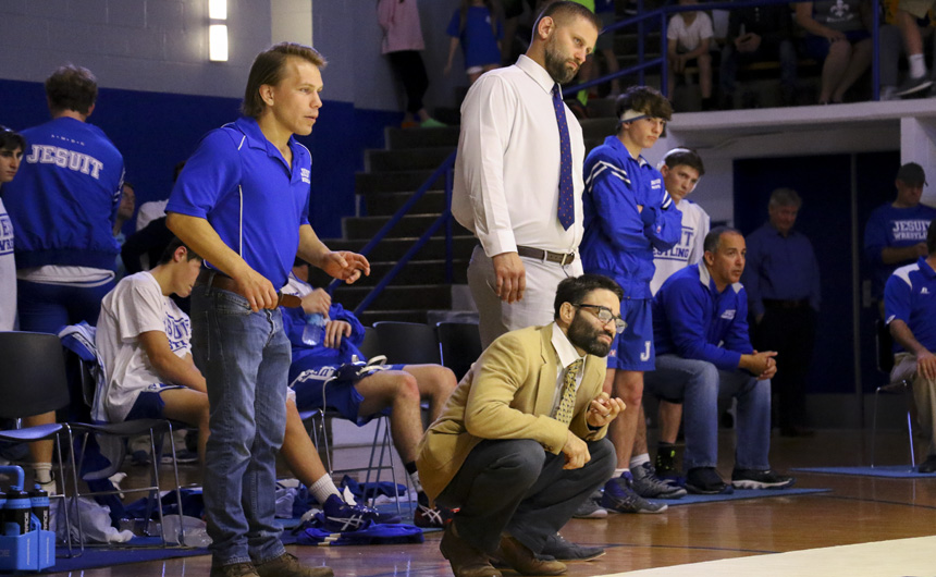 Efforts like these typically start and succeed with leadership. Seniors Paul Treuting and Adam Larriviere, who Coach Moran named as team captains for the 2017-18 season, coordinated a tailgate outside the Roussel Building. Thanks to Blue Jay wrestling parents, students enjoyed jambalaya and music before making their way to the newly renovated Jesuit gymnasium, the Birdcage.
