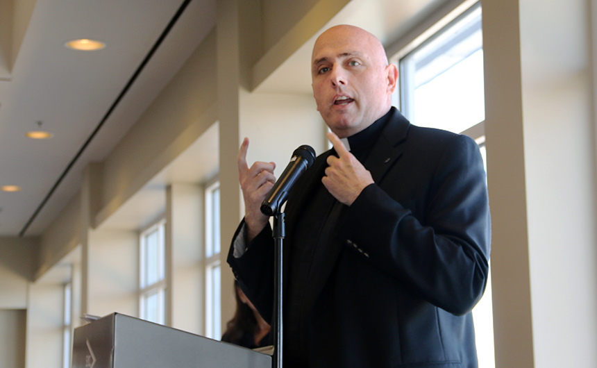 Father Christopher Fronk, S.J., president of Jesuit High School, introduces the 2018 Alma Mater Award (AMA) Honorees. -