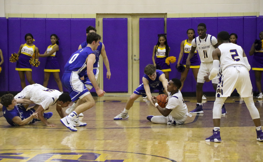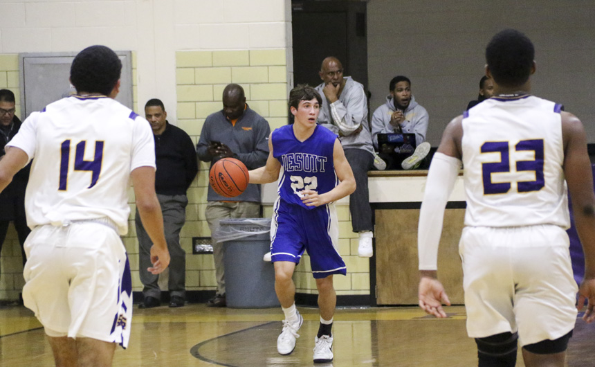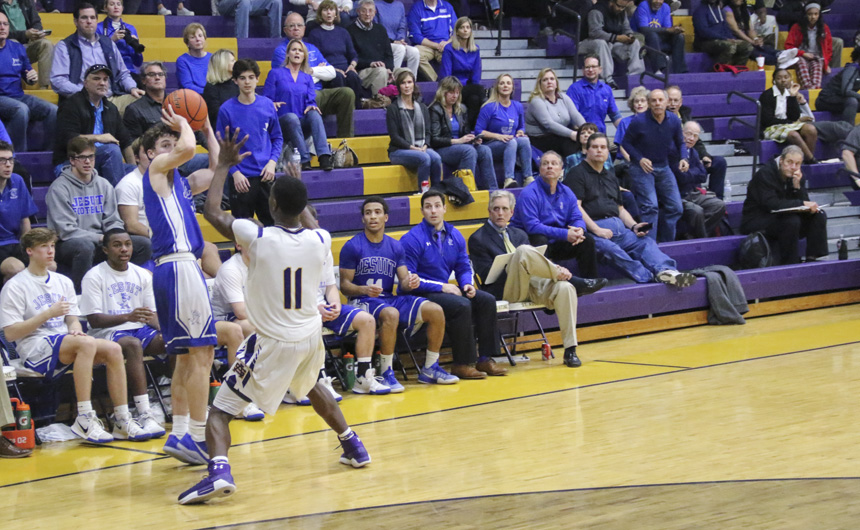 Both Jesuit and St. Augustine entered Tuesday night’s basketball game with just one district loss. Since the winner would place themselves in the driver’s seat for the second round of district play, it was not the best game to be missing the team’s leading scorer, junior Elijah Morgan, with the flu. Be that as it may, the Jays fought hard in the contest but came up short, losing the Purple Knights 26-23. In the first meeting of Jesuit and St. Augustine earlier in January, the Jays had been able to prevail in another low-scoring battle, 36-35.