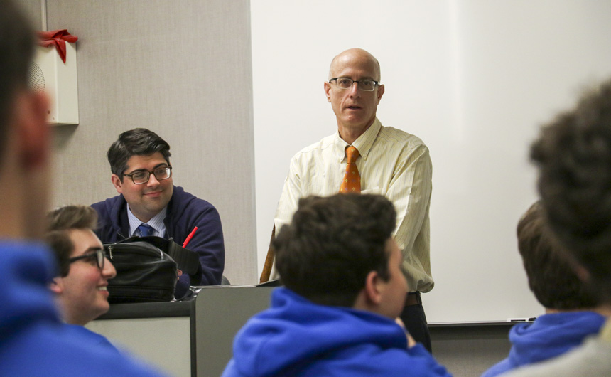 Mr. Chris Bowes and Mr. Gary Wyss, English teachers and <em>Calliope</em> moderators, listen to student presentations during the <em>Calliope</em>‘s election meeting, where the group selects their upcoming editors.