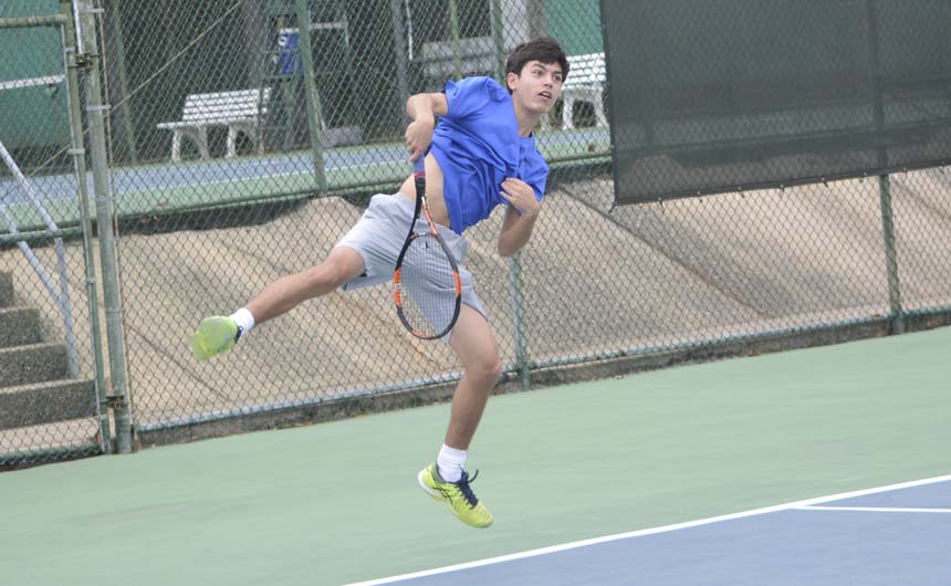 Dexter Webster goes airborne for a backhand volley. -