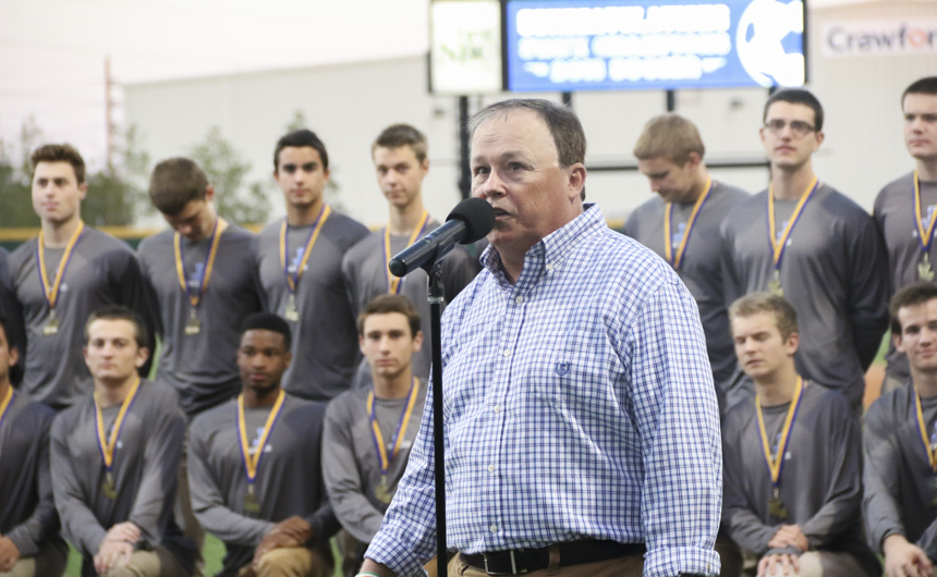 Coach Hubie Collins addresses the crowd at John Ryan Stadium, listing the many merits of the players on his 8th state championship team.