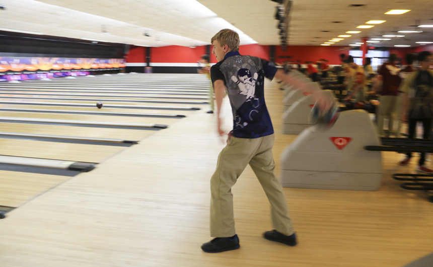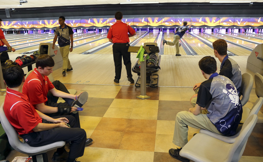 The competition watch as senior Alex Barron bowls his way to a spare. -