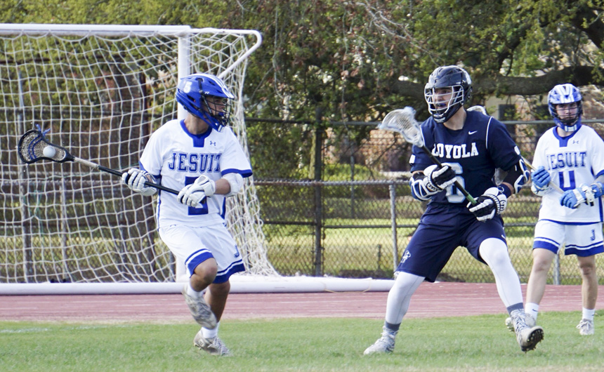 On March 3, the varsity lacrosse team defeated district rival Brother Martin by a score of 10-7. Each time the Jays scored to take a lead, Brother Martin responded to tie it up. This pattern continued until the teams were all square at 7 goals halfway through the fourth quarter. Over the next 3½ minutes, Jesuit scored three goals (one by Will Simon and two by Ross Champagne) to reach the final outcome of 10-7.