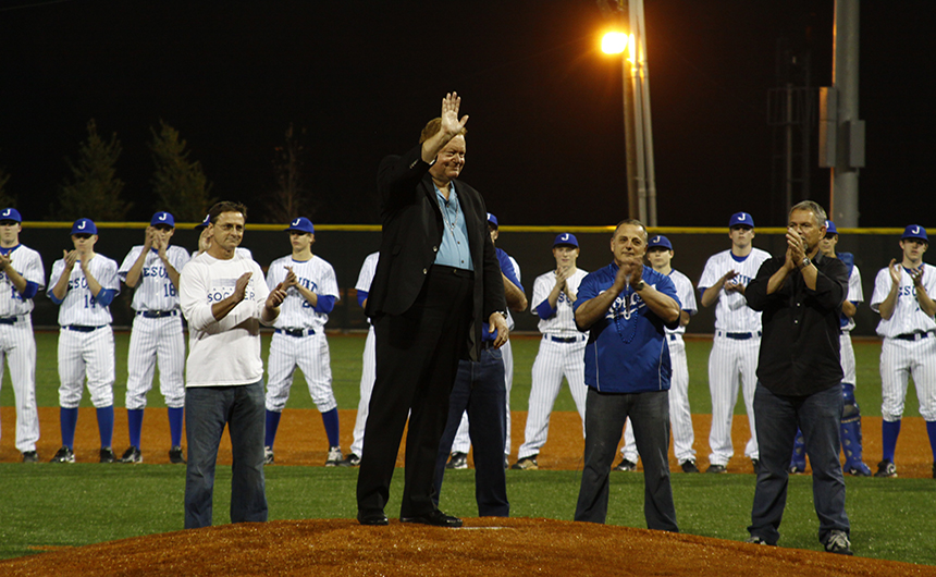 Rusty Staub ’61 receives a round of applause at the Opening Ceremonies of John Ryan Stadium on March 2, 2012.