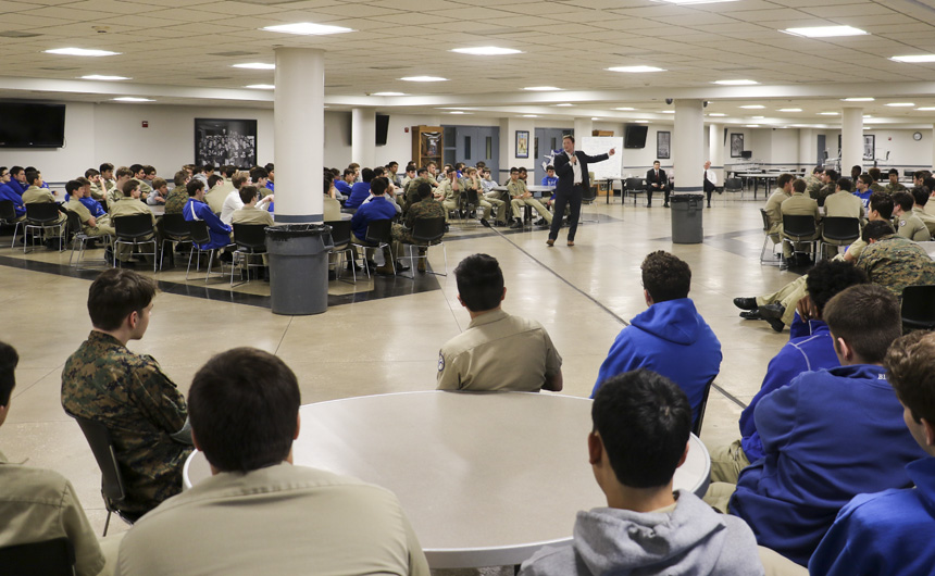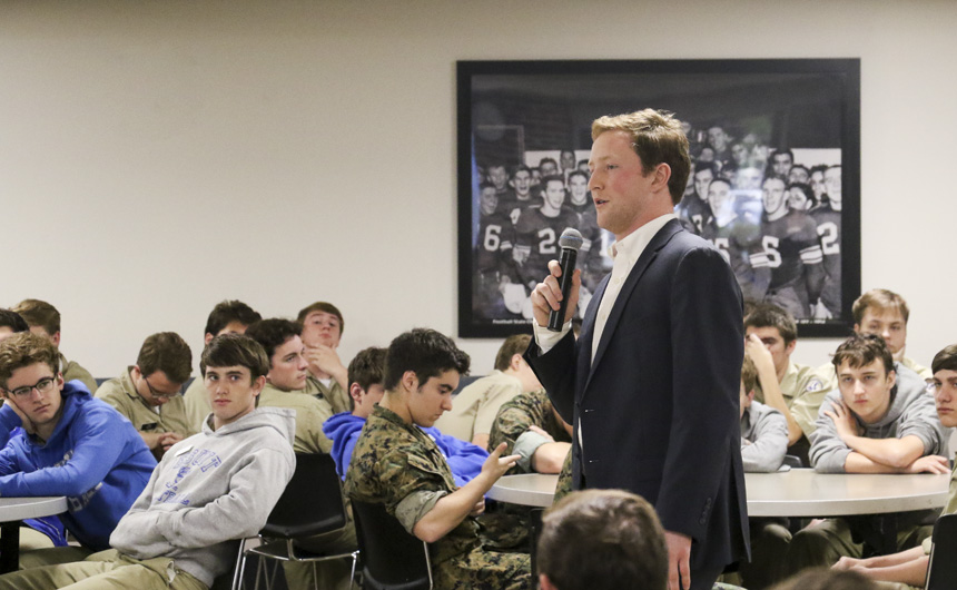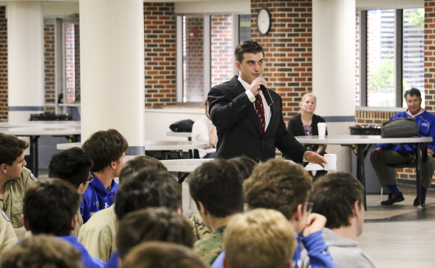 Jesuit alumni Gregory Schwing ’11 and Dillon Knight ’15 returned to campus this week to offer college advice to seniors before their graduation in May.