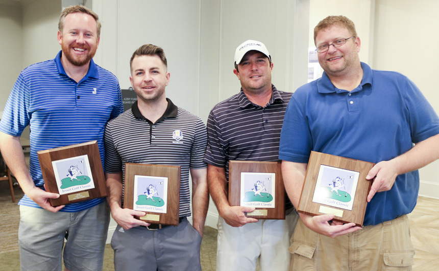 Scott Lagarde, Roland Waguespack, Wiggins Edrington, and William Elliott receive their Class Cup trophy from Golf Classic chairman J.P. Escudier ’95.