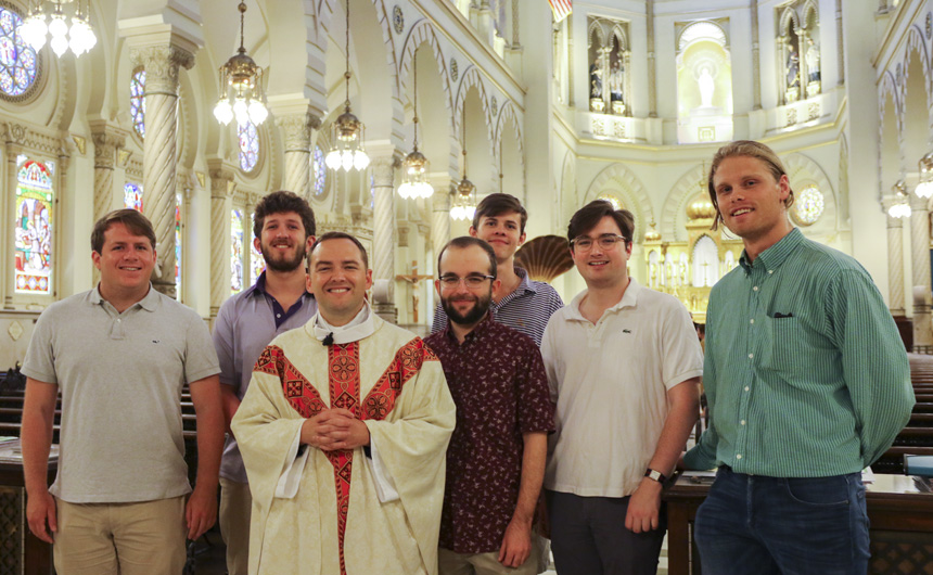Jesuit alumni Brendan Besh '14, Cameron Pelitere '17, Jason LaHatte '15, John Kemmerly '16, Jack Caliva '14, and Quint Crozier '13 join Fr. LaLonde for his Mass of Thanksgiving at the Jesuit Church. -