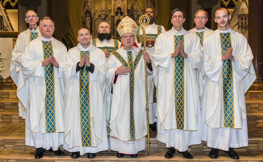 Fr. LaLonde with his brother Jesuits who were ordained – Fr. Penn Dawson, S.J., Fr. David Paternostro, S.J., and Fr. Michael Wegencka, S.J. – and the consecrating bishop, the Most Reverend Terrence T. Prendergast, SJ, Archbishop of Ottawa. (photo by Fr. Vincent Orlando, S.J.) -