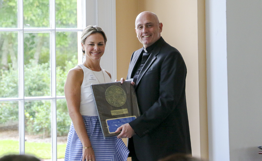 Fr. Fronk presents Celebration chair Lori Frischhertz with an award for her outstanding service to Jesuit High School. -