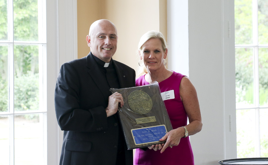 Blue Jay Bazaar chair Anne Black is presented with an award from Fr. Fronk for her dedicated service to the school. -