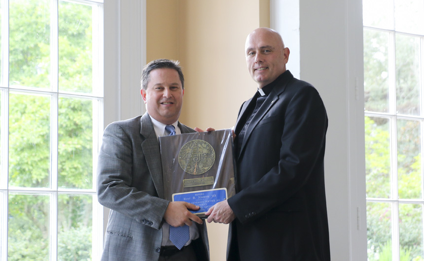 Fr. Fronk presented René Alvarez '83 with an award for his generous service as chair for the Living Endowment Fund. -
