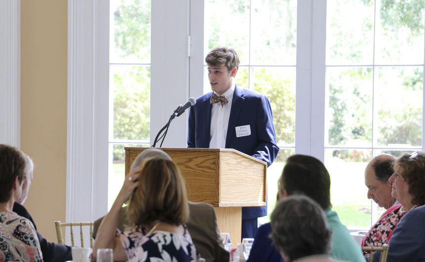 A new feature of the program was a presentation by current senior Zachary DeBlieux. He was introduced by Jeremy Reuther, who, in addition to being Jesuit’s communications director, also teaches DeBlieux in a theology elective course and provided colorful classroom anecdotes as an introduction. DeBlieux spoke of his formation at Jesuit, which was characterized in his early years by living in the shadow of a high-achieving older brother. Now that Zachary is a senior, he sees all the ways that the Jesuit faculty has helped shape his character through his involvement in athletics, Sodality, and the service project program.