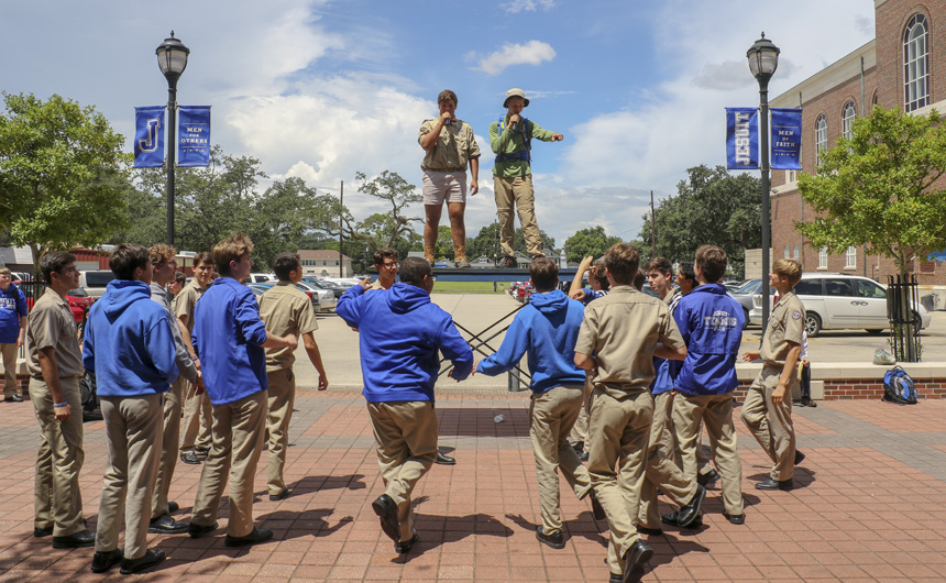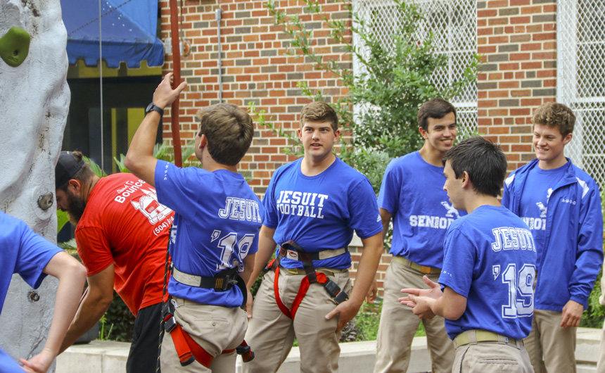 Jesuit student council members are serving as survival experts for Welcome Week 2018, teaching Blue Jays to survive outside after a summer of indoor activity. The highly-anticipated Welcome Week skit kicked off the week at Monday’s Morning Assembly in the courtyard. A classic song for the outdoors, “Welcome to the Jungle,” inspired students to get into the spirit of the fun-filled week, and a giant truck full of survival experts surprised the audience with this year’s theme—”Jays Survive Outside.”