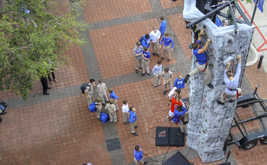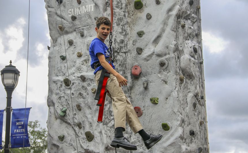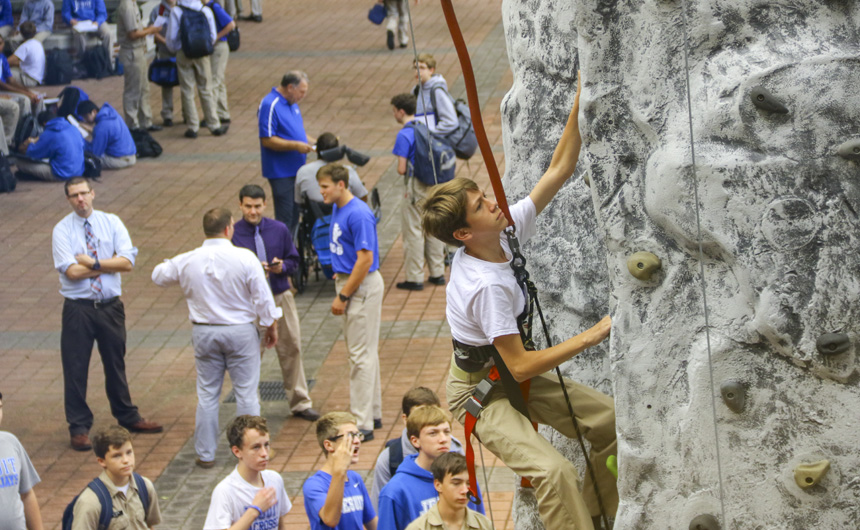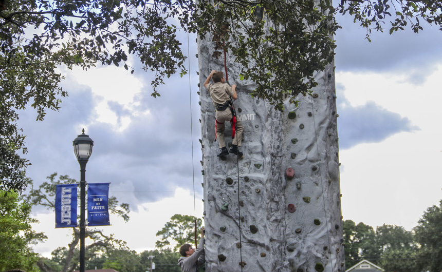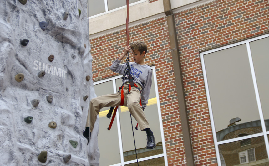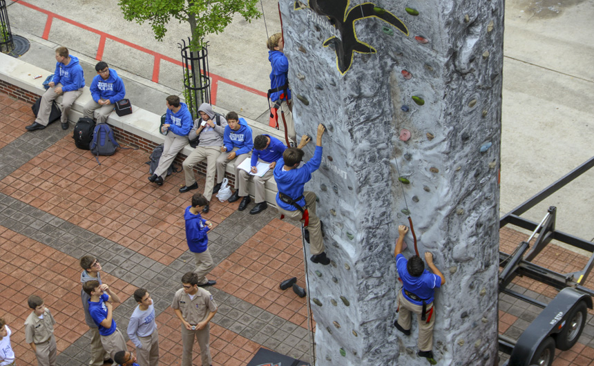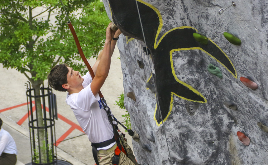 On Thursday, the survival activities of Welcome Week culminated in one final test of strength and skill – the rock wall. Students flocked to Traditions Courtyard to test their abilities and race one another up a 30+ foot climbing wall with three routes. Young and old students alike embraced the challenge and had a blast as Welcome Week 2018 drew to a close.