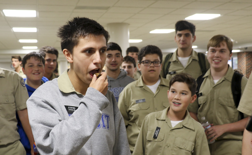 Channeling their inner Bear Grylls students were challenged to eat grubs and bugs like roasted crickets, locusts, super worms, and mango-flavored silkworm chrysalises. If a student managed to slurp down one spoonful of each bug they were rewarded with their choice of a candy bar or a donut. Three brave souls, seniors Stephen Zazulak, Peter James, and Donovan Reynolds, took on the ultimate bug challenge of eating a whole giant water scorpion. They each received a box of donuts for crunching down on the biggest bug around.
