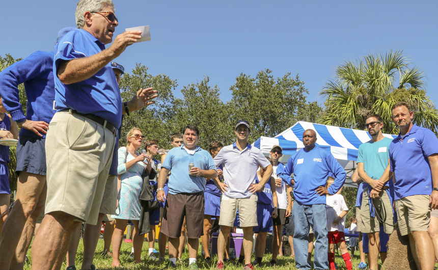 Head coach Rudy Horvath '86 addresses the team and the cross country alumni after the meet. -