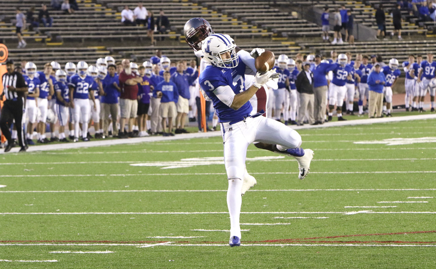 Brenden Berggren holds on to the ball for a sideline touchdown catch, bringing the Jays within a score late in the fourth quarter. -