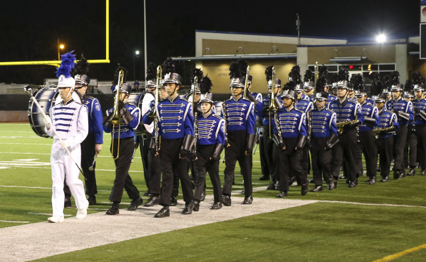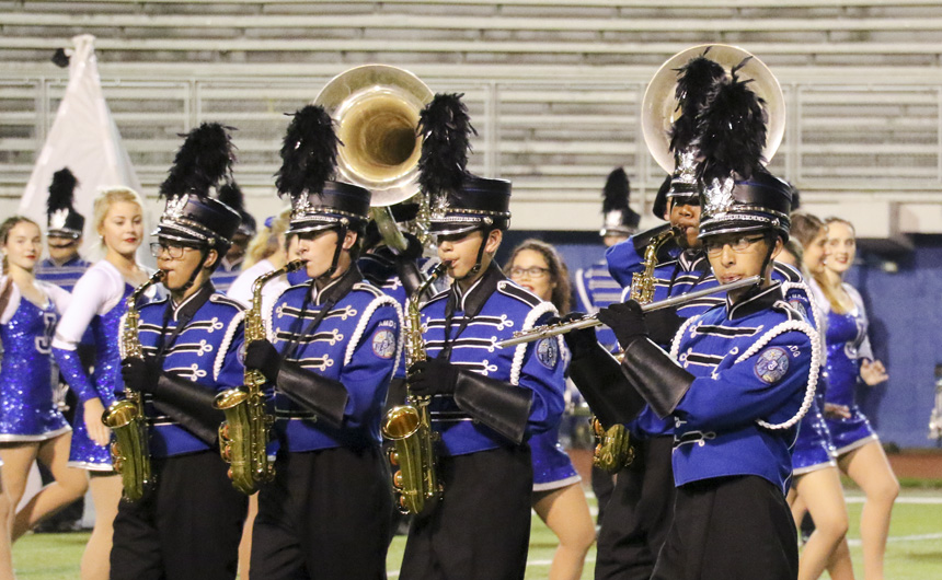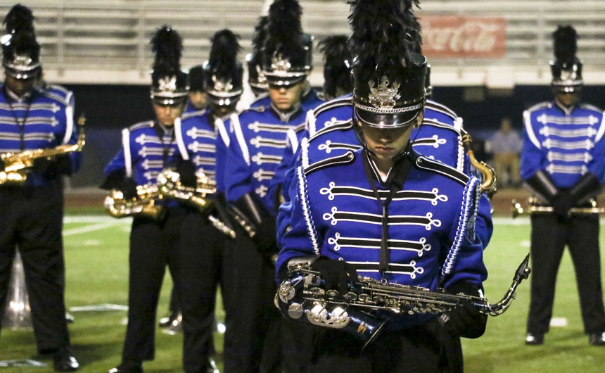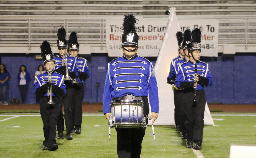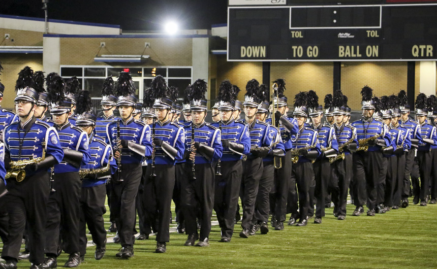 The band processes onto the field for the big show. -