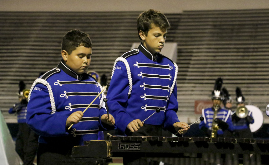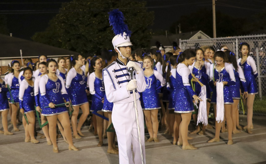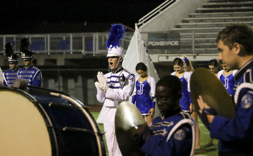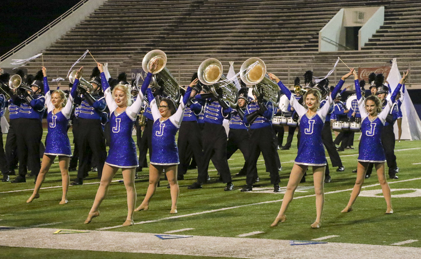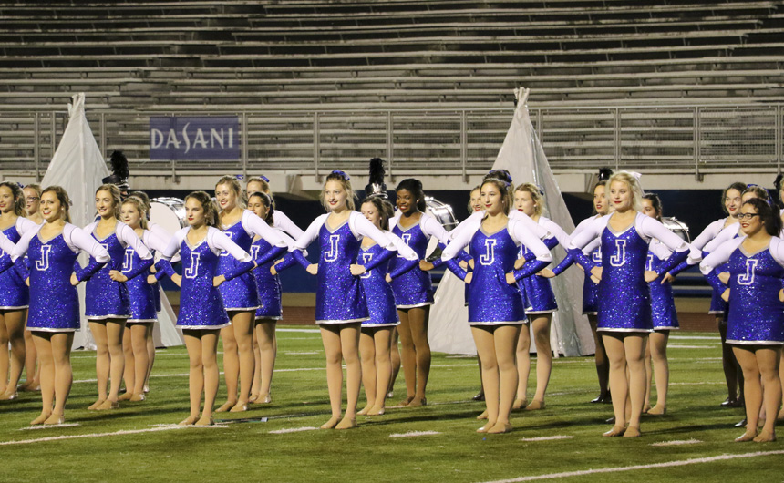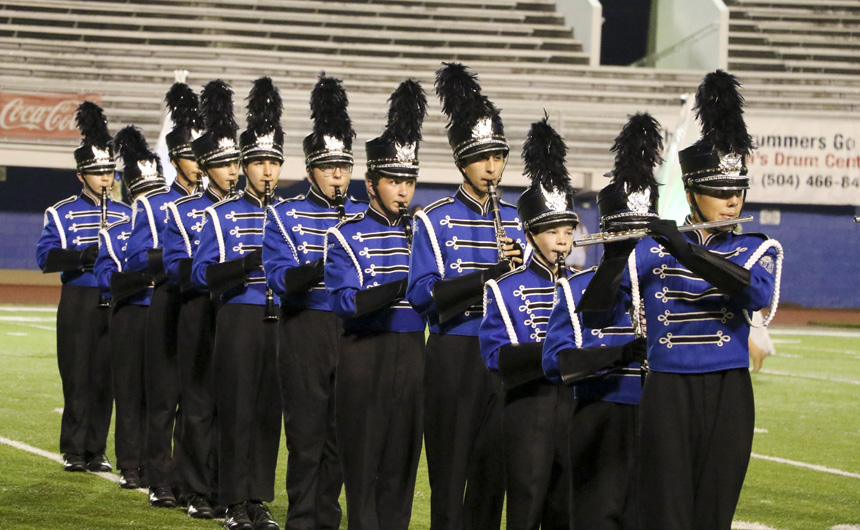 On the mark of an unearthly voice reverberating, “Fusion!” through the crowd, the Blue Jay Marching Band and Jayettes sprang into action at the LMEA District VI Marching Assessment Festival at Joe Yenni Stadium in Metairie on Monday, October 29. With glowing prisms as their backdrop, the Jesuit band members wove a performance full of musical artistry and flair as the Jayettes accompanied them with intricate dance numbers centered around triangular props. Very happy with the execution of the show, band director Joe Caluda praised his students saying, “Fusion was different than anything we have done in the past and without a doubt, one of the most ambitious shows we have ever performed. Both the Band and the Jayettes worked extremely hard throughout the entire marching season and did an amazing job with such a complex show. This year’s show integrated very difficult music, challenging fast-paced drill, computerized electronics, and a vast array of visual props and lighting.”