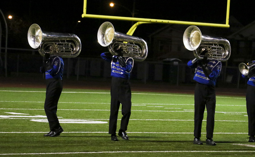 Back on the field, the tuba players are moving in sync. -