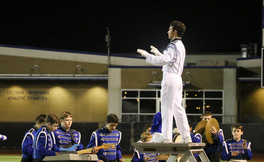Drum Major Willaim Mentz conducts the bands from up high. -