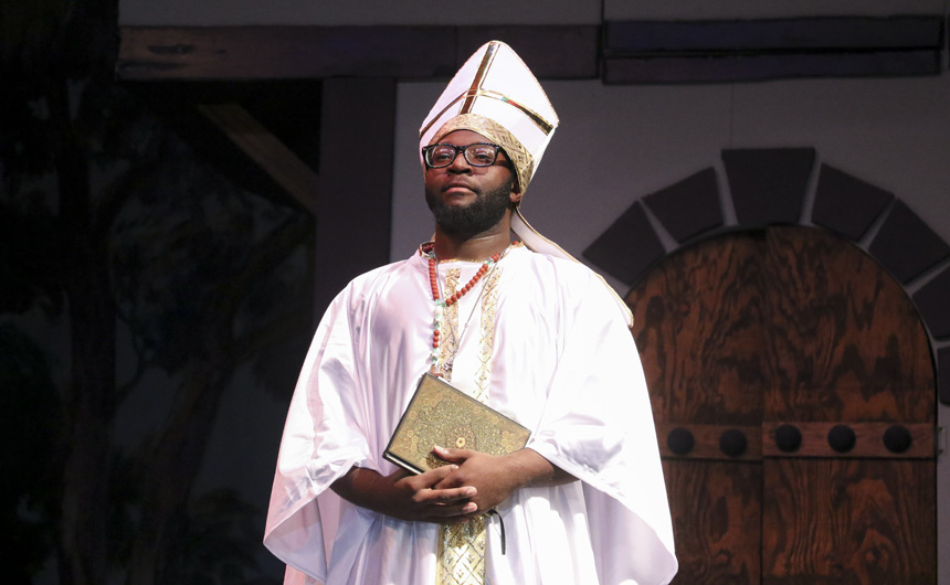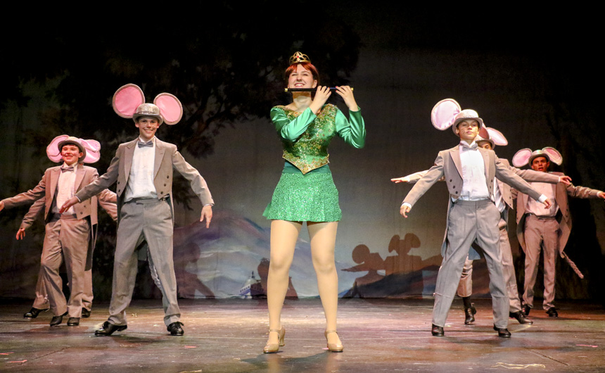 On stage, the depth of the Phils’ bench is seen in the leading roles, which are performed by students from nearly every grade level. Junior Ben Schaubhut tackles the daunting title role with commanding presence and voice. His Princess Fiona is given a powerful voice by Ursuline Academy senior Diana Ledet, a veteran member of the troupe. Sophomore Carter Morris throws all the slick attitude as the sidekick Donkey. And freshman Matthew Busenlener just about steals the show as the diminutive villain Lord Farquaad.