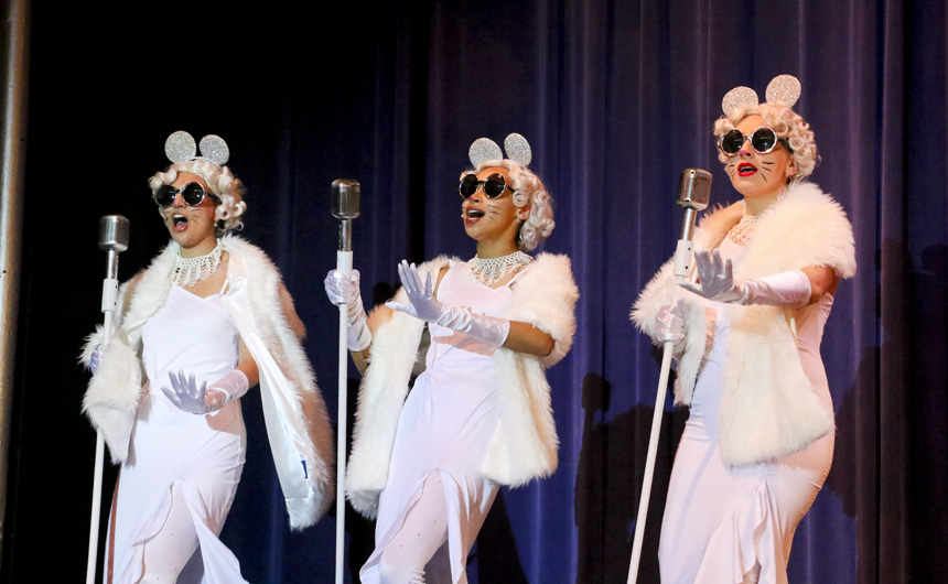 Choreographer Kenny Beck, Class of ’79, gets remarkable moves from the company, building complex designs step by step. Technical director and set designer Ron Goldberg guides the crew building confidence and skills. Accompanist Justin Blanchard prepares the cast musically with patience and precision (even somehow eliciting lyrical performances from certain untrained faculty members). And the artistry of makeup designer and former Phil Kaitlin Lombard helps the actors delineate characterizations.