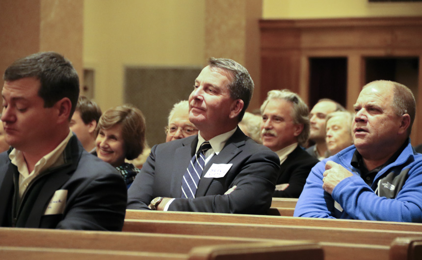 1983 classmates Brian North and Mike Varisco sit among fellow alumni, current parents, and parents of alumni at the 2018 Evening of Advent Reflection.