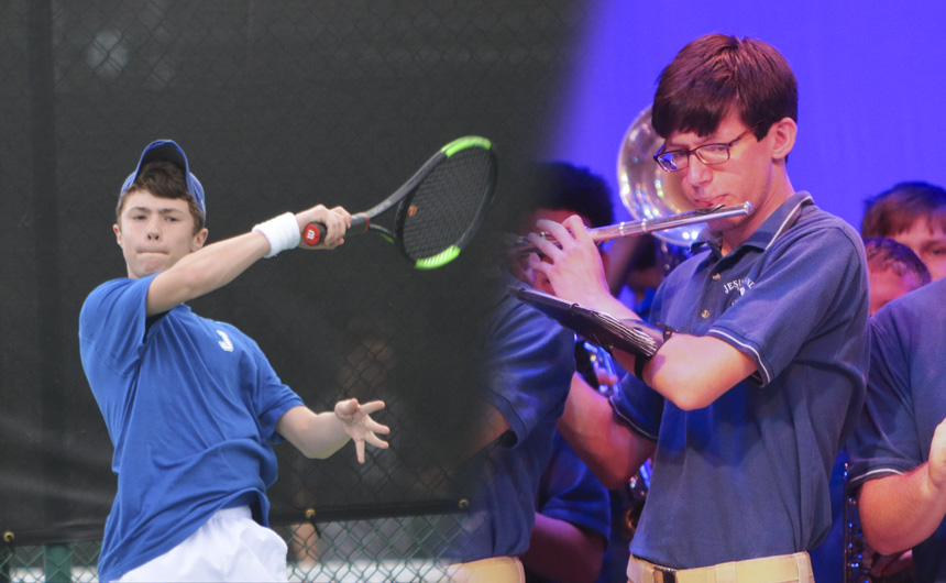 Juniors Tom Levy and Dominic Stoner, who earned top scores, participate in student life at Jesuit through the varsity tennis team and the Blue Jay Band, among other involvements.