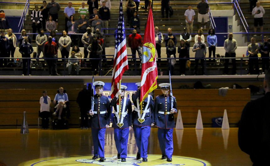 The MCJROTC presents the colors before the game begins. -