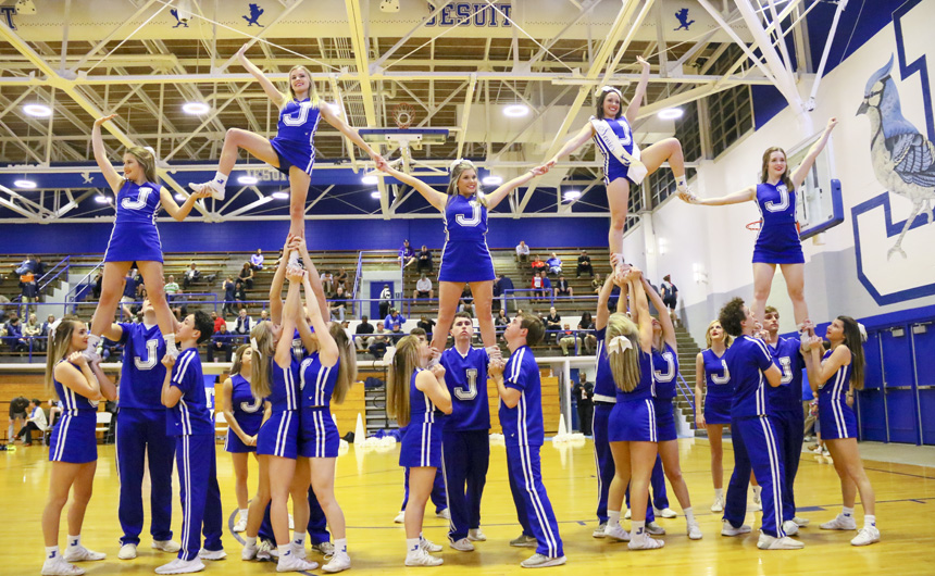 The Jesuit cheerleaders perform their routine during halftime... -