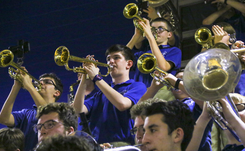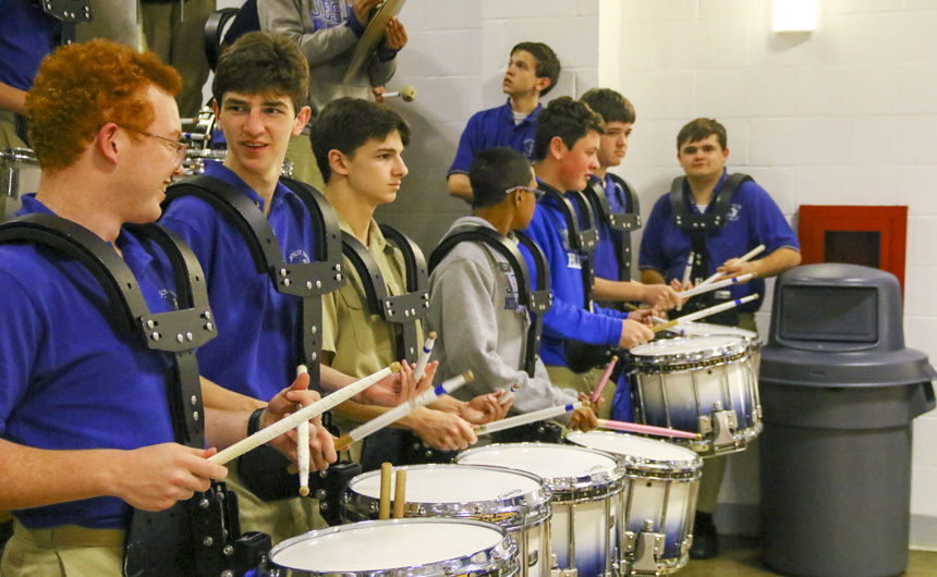 The Blue Jay drum line rattles off the beat during halftime and... -