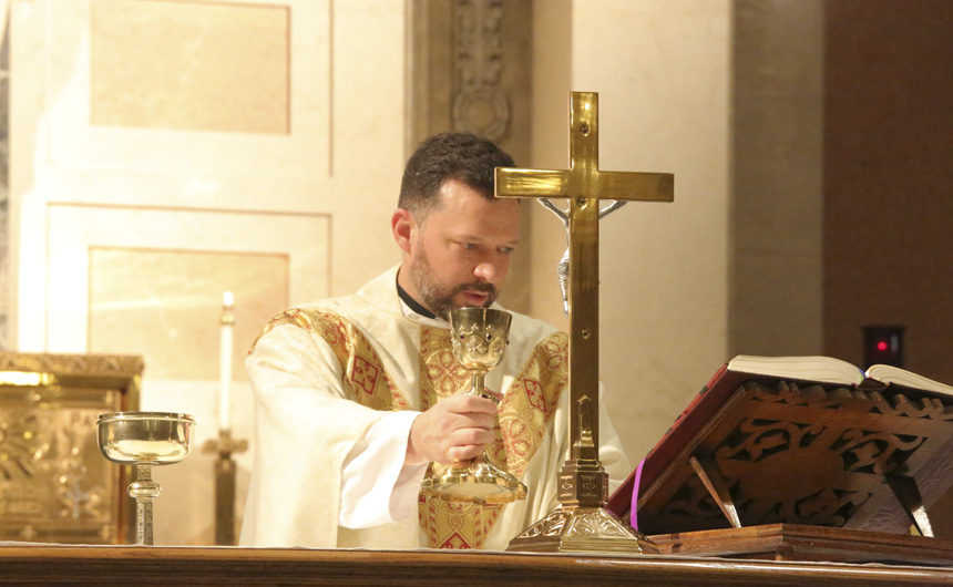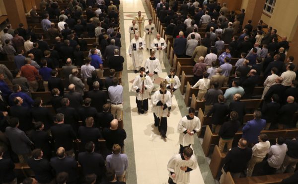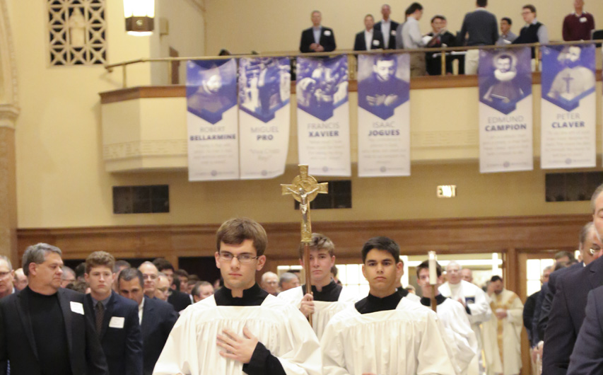 The 5 p.m. Mass in the Chapel of the North American Martyrs was celebrated by Jesuit superior Fr. John Brown, S.J. Concelebrating were president Fr. Christopher Fronk, school chaplain Fr. Kevin Dyer, as well as Frs. Donald Saunders and Paul Shaughnessy, all members of the Society of Jesus.